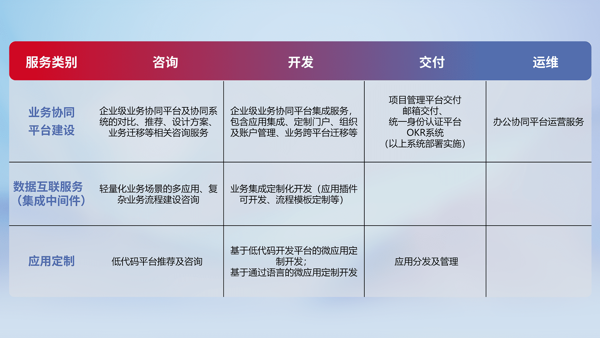 针对钉钉、、、、企微、、、IDaas等平台级产品提供产品的规划、、、方案、、、交付、、、、定制化开发等服务,,实现如统一协同办公、、、智能客户服务、、、、混合会议管理、、智能数据查询、、、、等业务场景,,,实现数字化转型。。
