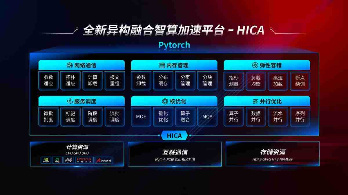 通过自研的服务层、、、中间适配层、、、、以及调度编排算法,,采用数据并行、、模型并行等多种并行方式,,把并行计算任务进行有效的分解,,,使其分别由相应的软件栈和算力资源来承接。。。当GPU资源变化,,,HICA可以实时动态调度计算子任务并调整模型拓扑和架构,,,,以充分聚合各种算力资源。。