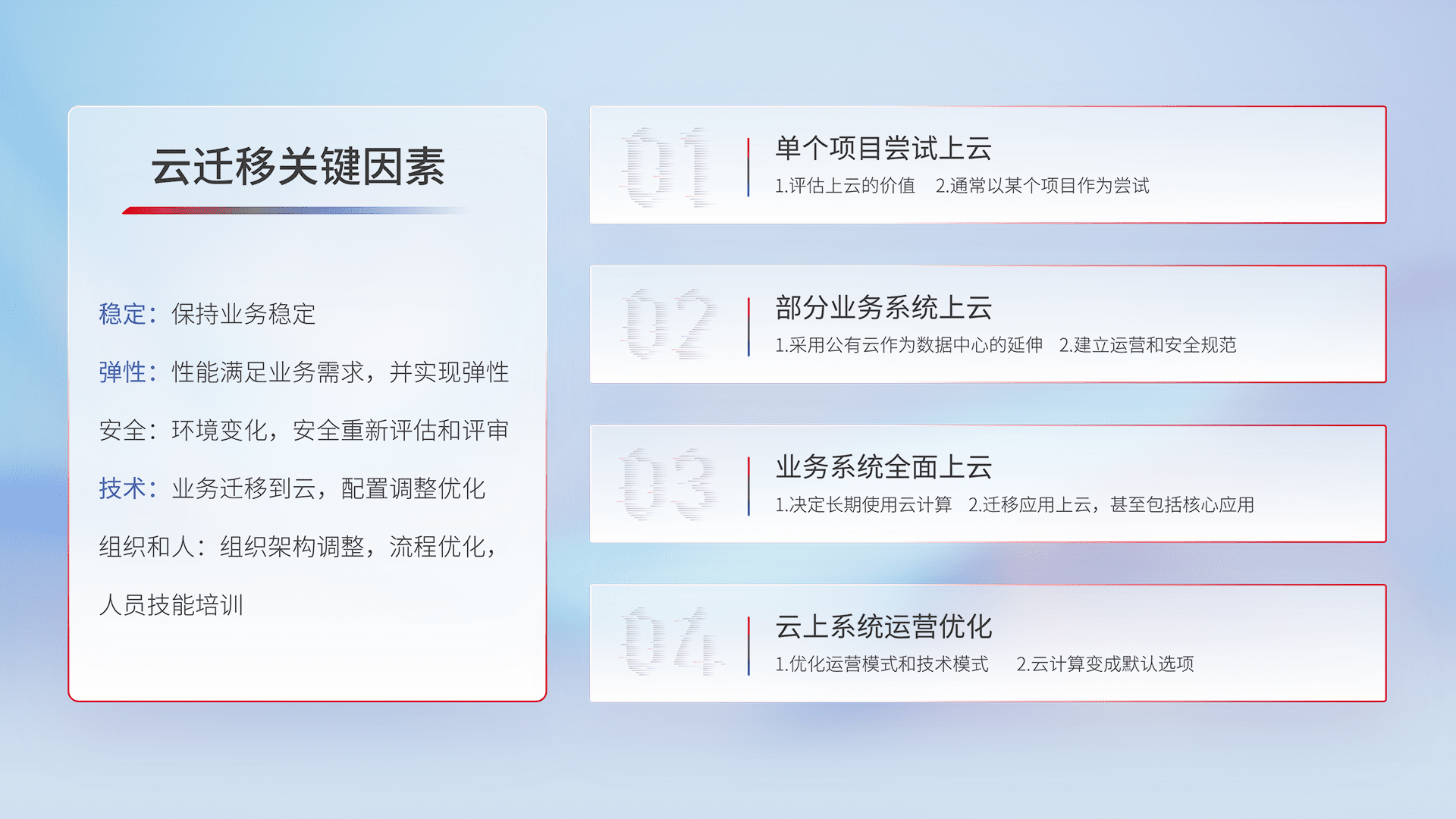 结合实际业务,,,从规划设计、、、云平台选型、、云原生改造、、、数据迁移、、、、集成交付,,迁移全过程为客户识别最佳上云路径,,,做好风险识别管理,,设计网络架构、、身份权限、、安全审计合规、、操作审计、、、、日志审计、、、、监控告警策略、、、、多站点容灾设计等,,,,对云上基础设施进行整体规划,,,提升IT治理水平,,,以满足弹性、、、、高可用、、、高性能的需求。。。