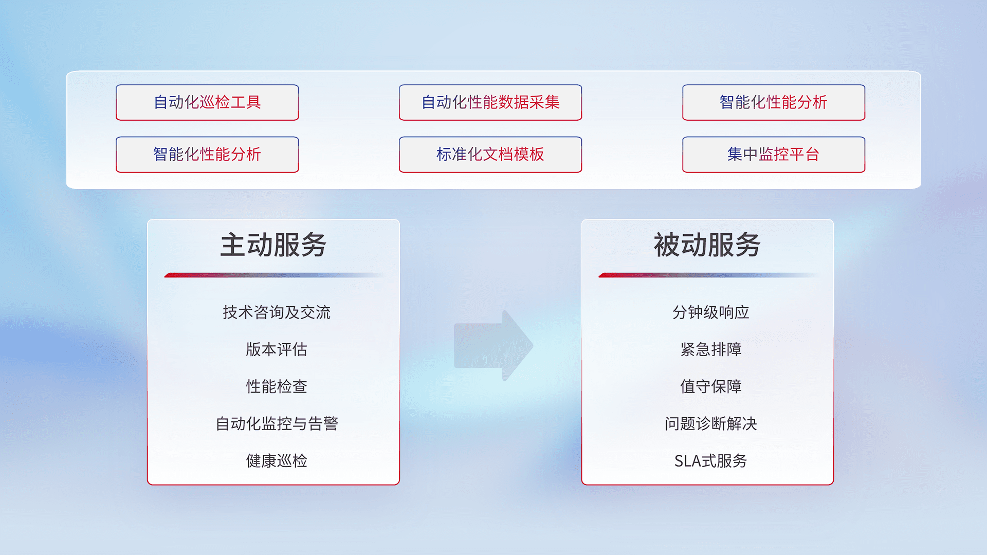 智能化工具和标准化文档,,保障服务质量,,提供主动服务(包含技术咨询、、、版本评估、、、性能检查、、自动化监控与告警、、、健康巡检)和被动服务包含(分钟级响应、、紧急排障、、值守保障、、、问题诊断解决、、、、SLA服务)。。。。
